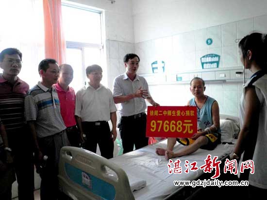 5月5日上午,徐闻二中校长邓堪辉、书记陈文华等学校领导带领学生代表一行到湛江农垦医院探望了患癌症住院的李健老师,并给他送去全校师生对他的祝福与爱心捐款97688.2元。在探望期间,邓校长详细了解李健老师的病情和治疗情况,安慰他安心治病,积极配合医生治疗,鼓励他一定要树立信心战胜病魔,争取早日康复,重返校园。李健老师及其家人十分感动,一再表示感谢学校的关怀,感谢同事和学生们的关心与帮助,康复后一定更加努力工作,回报充满爱心的大家庭。