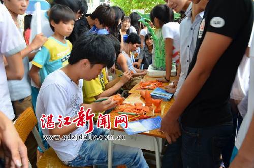 在咨询会现场,同学们三五成群聚集在自己喜好的专业学校咨询点前,咨询了解学校办学情况和报读事宜,并填写联系方式等相关表格。各招生学校频出新招,校园内的绿荫下一时热闹非凡。笔者走访其间,发现湛江市商业技工学校咨询点被同学们围了个水泄不通,原来这里在进行现场雕花演示,只见该校烹饪专业的3名学生在进行雕花表演,他们用小刀把胡萝卜雕成凤凰鸟、玫瑰花等物,一刀一割一丝不苟的毫不含糊。有的学校还让前来咨询的学生尝试动手操作等手段吸引学生,达到良好的宣传效果。如湛江高尔夫职业技术学校咨询处就聚集了不少学生,他们在饶有趣味地体验着这项高雅体育运动所带来的乐趣。