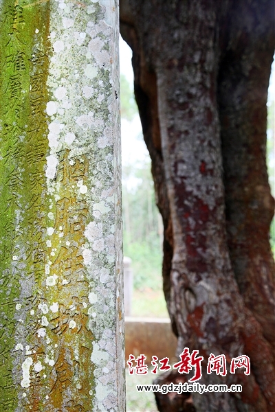 记者在现场看到,古树周边的八角围墙连同树前的石碑匾幅俨然构成一个景点,在石碑旁还树着一块写有“严禁损害古树,违者罚款”的铁牌子。树前的石碑上刻着村民捐款名单和数额,在八角墙入口处的两块石碑上刻着一副对联“胭悠千载茂 ,脂发万年长”。