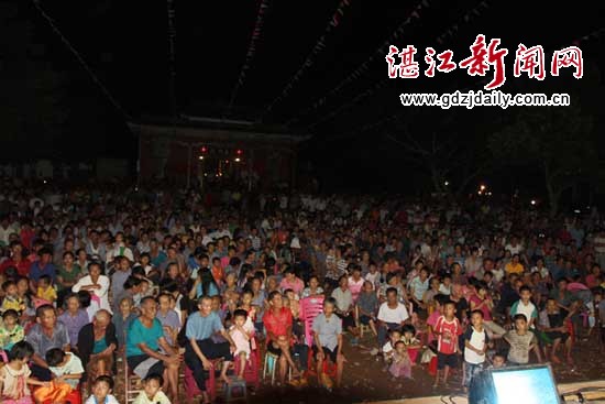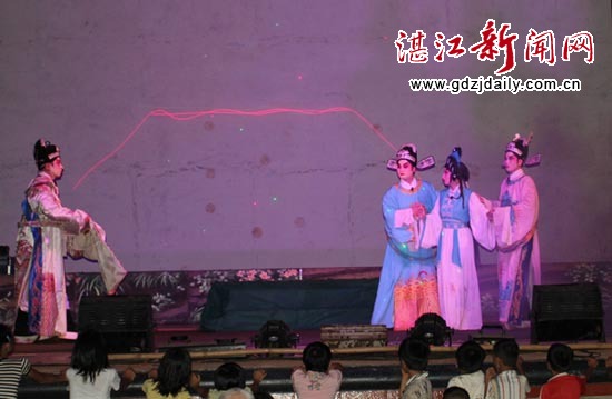 湛江新闻网讯:“雨仔落落落泱泱,侬去书房坐书窗,先生会教侬会拾,长大学成状元郎!”伴随着雷剧熟悉的音律,悦耳的唱腔在高云村文化楼上空飘荡,现场2000多名观众时而唏嘘叹息,时而鸦雀无声,聚精会神地观看徐闻县雷剧团演出的传统雷剧《雨仔落泱泱》 。这是笔者6月5日晚上在徐闻县锦和镇拿楚村委会高云村专场演出时看到的生动场景。本场演出是由徐闻县委宣传部组织县雷剧团下乡巡回演出活动的一部分。