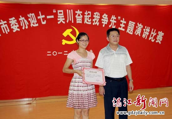 吴川市委常委、市委办主任吴松江(右)为获奖者颁奖