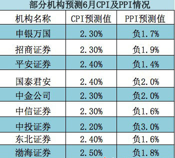 对6月份CPI的走势,中新网财经频道统计发现,多数机构及专家均认为,同比涨幅“破3”几成定局,并且极有可能跌破2.5%。《羊城晚报》等媒体报道显示,交通银行连平预测为2.4%;申银万国、中信证券、中金等预测为2.3%;兴业银行鲁政委和中投证券的预测为2.2%,为多家机构中预测值中最低。