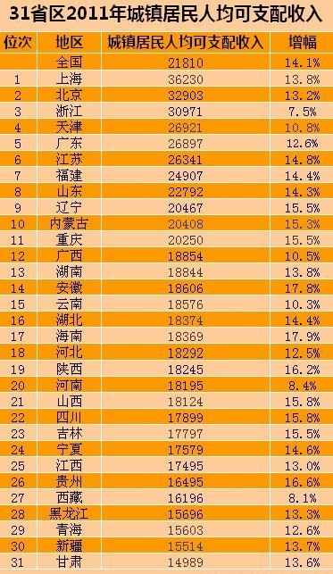 从增幅来看,有15省区人均可支配收入增幅超全国水平,中新网财经频道统计发现,海南、安徽、贵州、陕西、山西、四川、辽宁、重庆、吉林、内蒙古、江苏、宁夏、福建、湖北、山东这15省区的2011年人均可支配收入增幅超过了全国增幅14.1%。