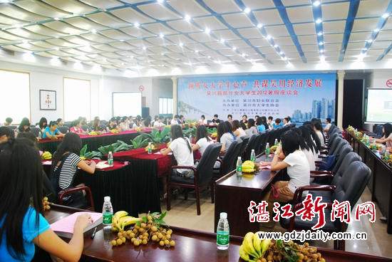 湛江新闻网讯:为了进一步了解大学生的学习、生活、思想、就业等方面的情况,本月25日,吴川市召开题为“倾听女大学生心声 共谋吴川经济发展”的吴川籍部分女大学生2012暑假座谈会。会议主要让学子们了解家乡,增强家乡情怀,鼓励和帮助吴川籍女大学生回乡就业创业,激发她们报效家乡的热情,强化促进经济发展的人才支撑,促进家乡经济发展。