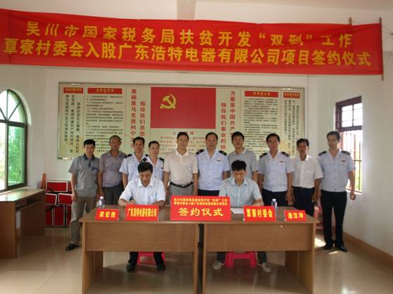 湛江新闻网讯:7月25日,吴川市扶贫开发“双到”工作再添新成果:该市国税局挂点帮扶的王村港镇覃寮村入股广东浩特电器有限公司成功签约,预计每年为村集体经济增收6万元。