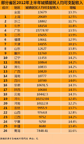 根据各省(自治区、直辖市)统计局公布的数据统计发现,截至7月26日,全国已有26个省份公布了2012年上半年城镇居民人均可支配收入。其中,上海、浙江、北京占据前三名,青海垫底。从增幅来看,宁夏增幅最高,达14.4%。
