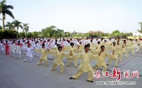 湛江新闻网讯:为庆祝 “全民健身日”, 8月8日上午,吴川市近千市民在江心岛小广场举行体育表演活动,倡导全民健身,喜庆伦敦奥运会举行。