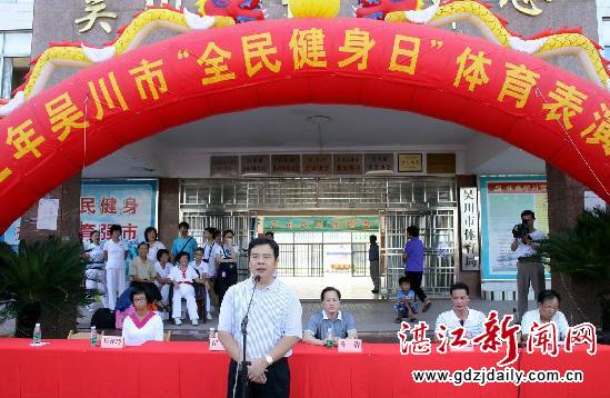“全民健身日”体育表演活动由吴川市体育局主办,吴川市委常委、统战部部长招励,吴川市体育局局长孙浩等领导到场祝贺。来自吴川城区的十多个民间体育健身团队表演了太极拳、腰鼓舞、健身操、剑术、彩绸舞、木兰扇、拉丁舞、跆拳道等十多个节目,其中个别团队曾在省、市比赛中获得过金奖或冠军。参加表演的一千多个男女老少服饰整齐,动作协调,节目精彩,充分展示了群众全民健身的热情和欢乐和谐的社情风貌。