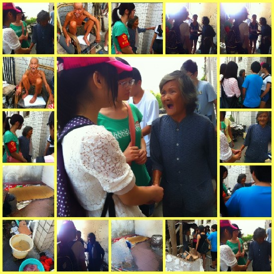 吴川希望义工团成员先来到位于吴川二中初中部后面立新街的60多岁江火娣老人家中,她无儿有一女,女儿出走已久,无人照料。靠低保费110元生活,房产局借给她的13平方米烂房子居住,行路不便,平时出行靠爬,站立要扶墙。成员们有的劈柴,有的喂江婆婆吃粥,有的为江婆婆捶捶手背,有的洗蚊帐、床席、衣服。成员们嘘寒问暖,江婆婆热泪盈眶。