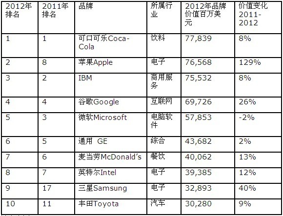 Interbrand 2012 最佳全球品牌价值排行榜前十名