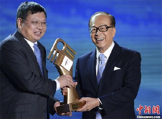 11月22日,长江商学院成立十周年庆典在北京举行。图为长江商学院院长项兵为李嘉诚颁发奖杯。中新社发廖攀摄