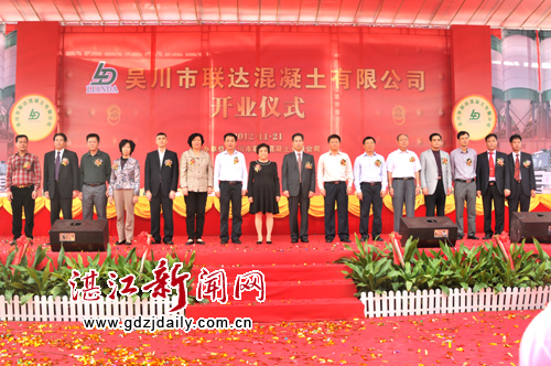 湛江新闻网讯:近日,吴川市招商引资“回归工程”重点项目——吴川市联达混凝土有限公司混凝土搅拌站投产运营。国务院原副总理吴桂贤,与吴川市委书记曹兴、市长江毅以及湛江市有关领导前往祝贺,为混凝土搅拌站投产剪彩。