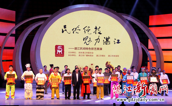 “民俗绝技,魅力湛江”民间特色技艺展演由政协湛江市委员会主办,来自湛江各地的民间艺术家表演了精彩的人龙舞、鹰雄搏击、狮蝎斗勇、勇攀刀梯等湛江民俗绝技,大“秀”变脸、记忆法展示、舞貔貅、粤剧南派艺术、高桩醒狮、穿令箭、滚刺床、单人木偶等民间绝活,一展湛江民间技艺风采。来自吴川市的舞貔貅、南派粤剧表演、单人木偶表演场面震撼,精彩纷呈,赢得了满堂喝彩,全部抱奖而归。