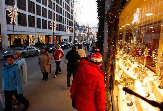 每平方尺平均房价3,951美元 当地时间2006年12月27日,瑞士圣莫里茨,街道上来往的观光客被橱窗里的奢侈品吸引。圣莫里茨曾经是两届冬季奥运会的举办地,所以滑雪设施的水平极高,繁忙的主大街上房地产的价格也让人叹为观止。