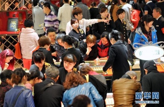 4月18日,南京一家金店内人头攒动。连日来,受近期国际黄金价格持续下跌的影响,我国各地金店纷纷宣布下调黄金价格,吸引了众多消费者入店“抢金”。新华社发