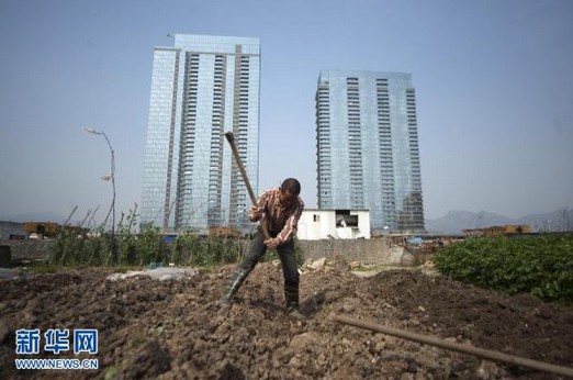 3月5日,一位农民在温州鹿城广场后的一片未开发的空地上开垦。该楼盘是温州市区的精品楼盘。2009年国家楼市“双限”之前,市场均价每平米75000至80000元,一度受到追捧,随后一路狂跌,跌至现在的成交价为45000元,差不多打了对折。