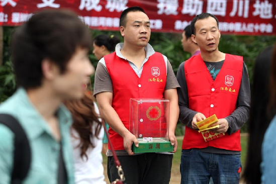 4月21日下午,深圳市红十字会与河南省深圳义工联在深圳莲花山公园正门,为雅安地震筹款,市民绕行。