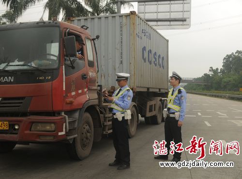 来到湛江站进出口处,见到交警高速公路第一大队多名民警摆开阵势,重点严查进出高速公路货车不按规定车道行驶、疲劳驾驶、超载驾驶、违法停车等交通违法行为,以及严查涉牌涉证、非法改装拼装、车身反光标识和侧后部防护装置安装不规范、车辆逾期未检验、驾驶人逾期未审验、不按规定时间路线通行等违法交通行为。据了解,当天共出动警力25人次,查处各类交通违法行为36起,其中大货车不按道行驶的6起、违法停车5起、超载驾驶11起、其他交通违法4起。