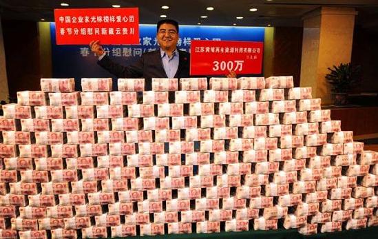 2010年1月22日,中国工商银行江苏分行大厅,陈光标与堆积如山的人民币合影。陈光标从中国127名企业家和个人那里组织来4316万元现金,想在春节前把这笔钱装入八万个红包,送到新疆、西藏、云南、贵州、四川等地区特困户手中。陈光标表示,他将在江苏乃至全国找一家最权威的公证处,对他的财产进行公证,以让全社会来对他进行监督。陈光标称,目前自己年富力强,未来争取要创造更多的财富,而所有挣回来的钱,他死后都将一分不留,全部捐献给社会。