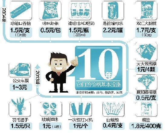 这些十年没涨价商品有五六十种。基本分为几类:生活类用品、交通工具和零食。生活用品类有:火柴、打火机、蜡烛等。食品类有:虾条、大大泡泡糖、袋装食盐、酱油等;交通类有:公交车票等。