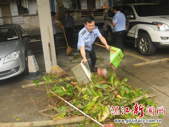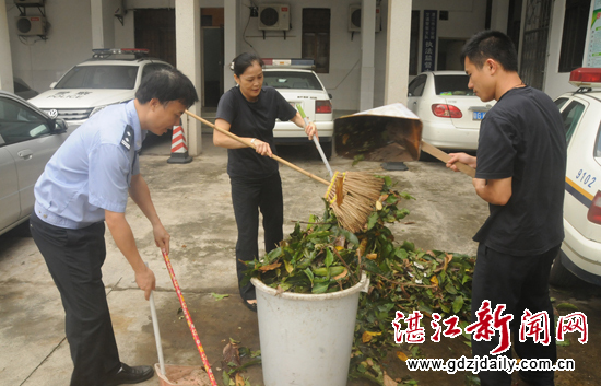 灾后第二天,交警支队领导加紧组织机关民警对办公院内的环境卫生进行大清扫,吴小明支队长、林德邦政委、杨东光副支队长等领导亲自带领民警拿起扫把、垃圾铲等工具开展环境清洁活动。民警们充分发扬了不怕苦、不怕累的精神,个个干劲十足,手拿扫把、铁铲等工具对公办院内的垃圾进行了清扫,清除杂物垃圾6小车;有的甚至直接用手捡拾树枝、树叶、垃圾,不放过任何一个卫生死角。在大家的共同努力下,不到2个小时,交警支队办公院内的卫生面貌焕然一新。