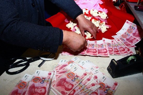 11月24日,江苏扬州,店主正在制作“人民币花束”。