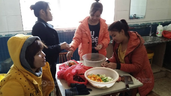 柬埔寨女孩在老板(左一,嫁到中国的柬埔寨人)的看护下集体开火做饭。