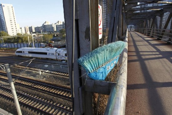 2013年11月26日消息,北京丰台区右安门翠林社区南侧的6条铁道上,凌空架设着一座天桥,每天迎送翠林社区万余居民进出南三环,被大家称作“连心桥”。11年来,几乎每天都会有一位老人出现在桥上,清扫垃圾,清理小广告。老人名叫窦珍,87岁,25日从桥上不慎坠落身亡。图为老人的扫帚还留下桥边。