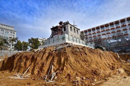2013年11月26日,济南市,因开发商施工建设需要,一座刚刚修复好的百年老建筑四周被挖空,老建筑在一个4米高的土堆上,成为一个“孤岛”。晓月 摄