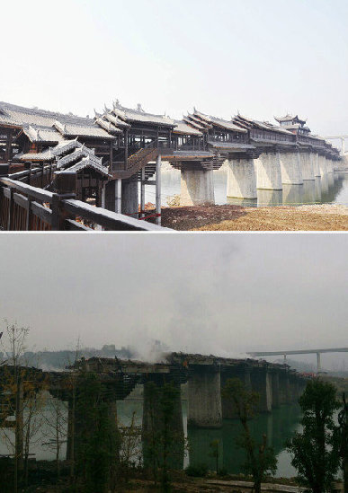 重庆濯水古镇风雨廊桥烧毁前后对比。网友 摄
