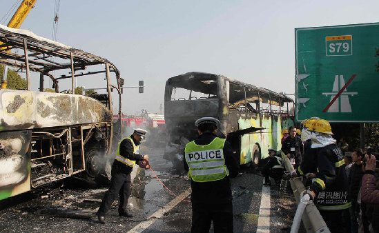 事故发生后,三辆大巴车上的乘客从车上转移。其中小车前后的两辆大巴上的乘客,慌忙中从破碎的车窗中跳窗逃生,10多人因跳窗受伤,目前已经送往医院治疗。