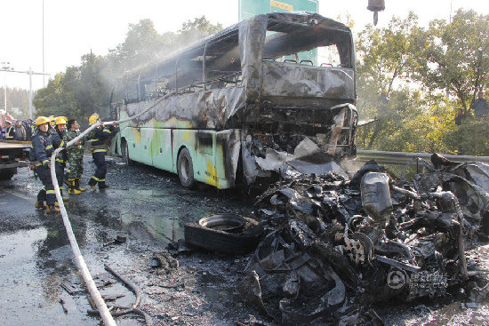 江苏小轿车与三辆大巴追尾 被挤成碎块