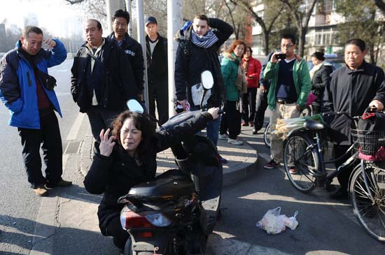 在争执中女子行走正常无恙,并死命撕扯外国小伙,造成其衣服被撕烂。随后该女子死命抱住了男子所骑车不撒手。事故造成现场交通拥堵一个多小时,女子多次瘫软抽搐,坚称被撞倒并让男子负责,急哭外国小伙。事发不久警方到场,双方前往煤炭总医院。经医生检查、X光拍摄后诊断该女子并未受伤。女子随即再度瘫软大呼难受。最后在双方调解下,外国小伙不得不给付1800元“医药费”,女子方才作罢自行离开。