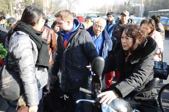 2013年12月2日,北京,中年女子拉住外国小伙的摩托车上让其赔偿。
