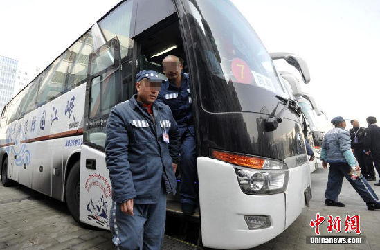 12月3日早上7时30分,代号为“123”行动的搬迁押犯任务正式开始。图为服刑人员到达新监狱——四川省成都大邑西岭监狱。安源 摄