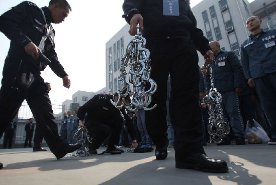 12月3日早上7时30分,代号为“123”行动的搬迁押犯任务正式开始。图为到达新监狱后警察卸下服刑人员的手铐。