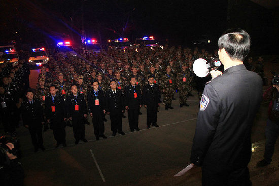 据川南监狱党委书记、监狱长、指挥长李跃辉介绍,押解行动共计投入武警、民警警力1000余人次,警犬20余只,押解车辆140余台次,大型物资运输车辆50余台次,途经宜宾、乐山、雅安、成都等市。监狱的搬迁行动将分批次进行,今日为首批,押解转移罪犯600余人,行程400余公里,累计押解车程将达到1200公里。图为川南监狱监狱长李跃辉发布战前动员。