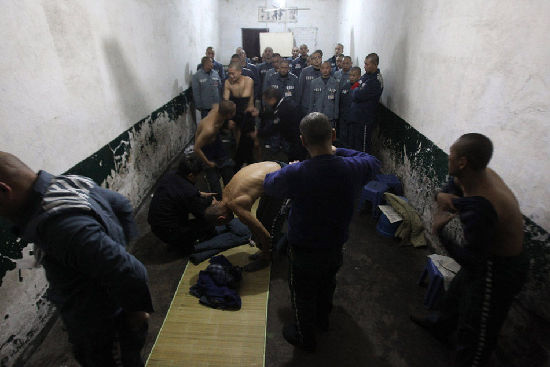 12月3日早上7时30分,代号为“123”行动的搬迁押犯任务正式开始。图为转运前警察在对服刑人员进行彻底搜身。
