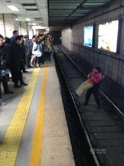 12月4日,一名女子在北京地铁一号线五棵松站跳下站台(手机拍摄)。当日11时左右,在北京地铁一号线五棵松站,一名女子经工作人员和乘客劝止未果跳下站台,逼停在驶列车。随后,该女子被工作人员制服并拉上站台。目前,事发原因正在调查当中。(新华社 王振)