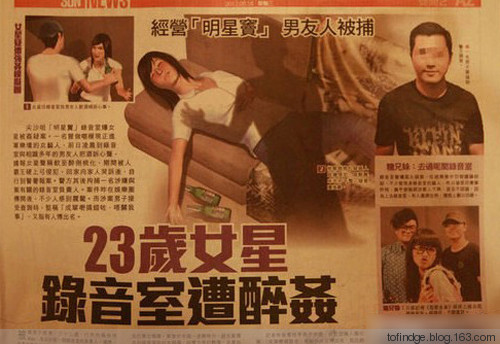 香港媒体报道,一名曾做嫩模现正进军乐坛的女艺人,前日凌晨到录音室与相识多年的男友人把酒诉心声,据报女星声称喝至醉倒沙发,期间被人霸王硬上弓侵犯,回家后向家人哭诉后,自行到警署报案。警方其后拘捕一名涉嫌与案有关的录音室负责人。案件昨在娱乐圈传开后,不少人感到震惊。又指有人博出名,被捕男子姓李,32岁,行内均称他作Max,是尖沙咀一间录音室的负责人。据悉,他是音乐发烧友,早前曾与人组Band,其后自立门户及亲自打理录音室,出租给人录制乐曲或上音乐堂,同时吸引乐坛众星到来试音和练歌,其Facebook贴满与逾五十名男女艺人的合照,包括容祖儿、王祖蓝、关心妍、钟嘉欣、傅颖、草蜢、陈奕迅、郑伊健等明星。