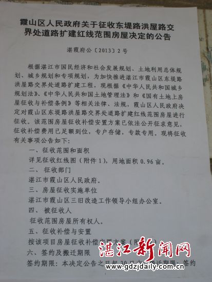 2010年11月开始进行的汉口路、东堤路扩建工程,已于去年初基本完成。但东堤路洪屋路交界处还有部分征收房屋因补偿方案原因的影响,致使留有“手尾,目前,仍有部分需征收房屋没有实施征收。11月25日,霞山区人民政府发出关于征收东堤路洪屋路交界处道路红线范围房屋决定的公告,其中征收房屋补偿安置方案同时公布。
