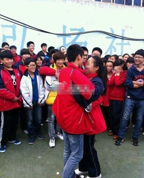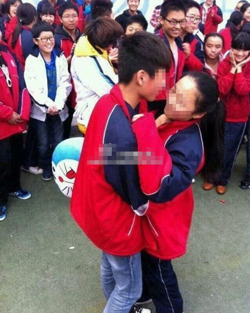 照片中一对穿着校服的初中生在学校操场当众求爱接吻,一旁围满了鼓掌的同学。