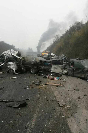 失控大罐车追撞18辆小车致8死26伤 现场惨烈