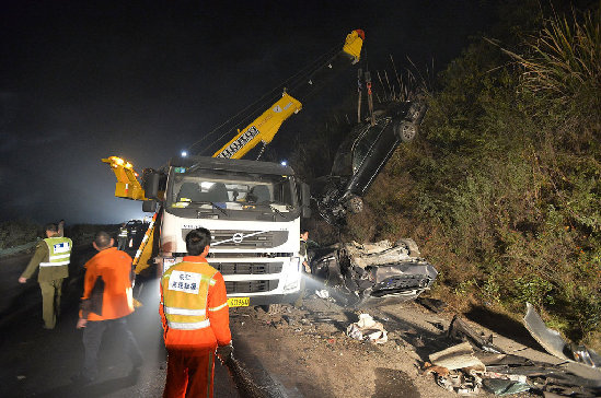 图为成自泸高速自贡往成都方向,据仁寿出口33公里处,清理事故现场的毁坏车辆。