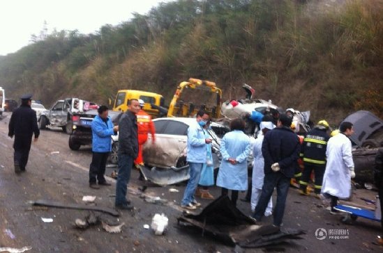 失控大罐车追撞18辆小车致8死26伤 现场惨烈
