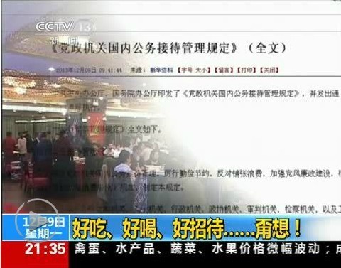 解说:今年年初,中央发布《关于严禁中央和机关使用“特供”“专供”等标识的通知》。年底将至,中央又及时发布了《党政机关厉行节约反对浪费条例》。与此同时高档饭店从高朋满座到门可罗雀,高档酒供不应求到无人问津,三公消费也在制度的监管下,开始走向规范,中央纪委监察部也从自身建设抓起,今年1-8月与去年同期相比,他们的尾部机关会议费下降了84.06%,招待费下降52.07%,培训费下降37.87%,印刷费下降13.49%。