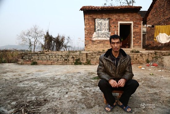 2013年12月7日,湖南省耒阳市遥田镇红卫村,张远古坐在自家屋前。女儿死了,老婆被警察带走了,家里只剩他一个人。(图/胡巍)