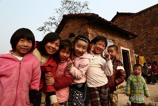 2013年12月7日,湖南省耒阳市遥田镇红卫村,一群孩子在张远古家的房子前合影。他们说,此前没有和张的女儿玩过,因为害怕她有精神病的妈妈。对于未经世事的他们而言,张的不幸更像是一个有悬念的恐怖故事。(图/胡巍)