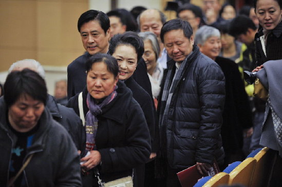 2013年12月10日,中国交响乐团纪念李凌诞辰100周年音乐会在北京音乐厅奏响。本场音乐会中,我国老一代艺术家纷纷登场,其中包括93岁指挥家韩中杰,90岁指挥家严良堃,80岁女中音歌唱家罗天婵,74岁钢琴家刘诗昆,74岁指挥家陈燮阳,60岁指挥家邵恩等。图为彭丽媛步入会场。