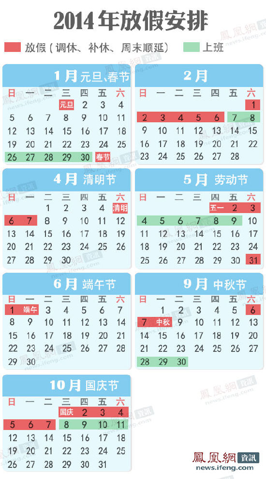 经国务院批准,现将2014年元旦、春节、清明节、劳动节、端午节、中秋节和国庆节放假调休日期的具体安排通知如下。